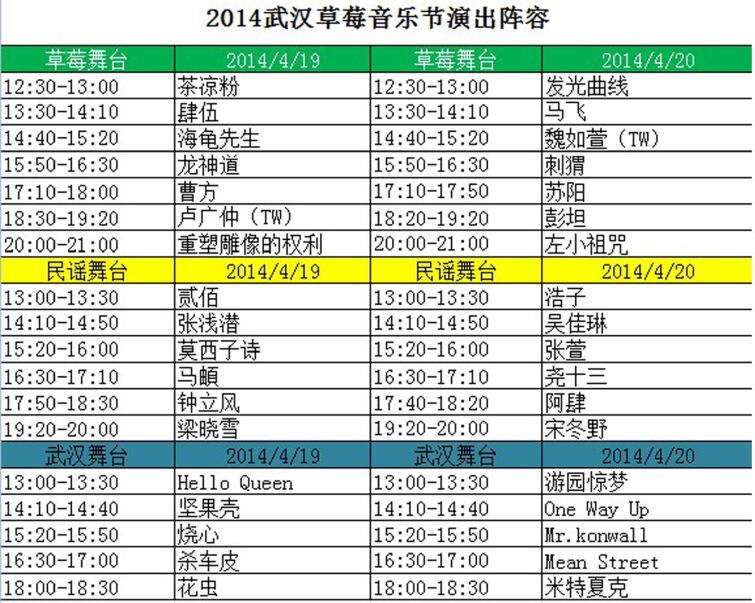 地图2014年4月19-20日,武汉草莓音乐节将迎来第三届,场地依然是武汉体育中心。较之前两届音乐节,本届武汉草莓加大整体投入,舞台升级,艺人规模也有相应提升,将设三个舞台,邀请36组各类艺人参加,为期两天的第三届武汉草莓音乐节将为武汉乐迷带来一场音乐的饕餮盛宴。