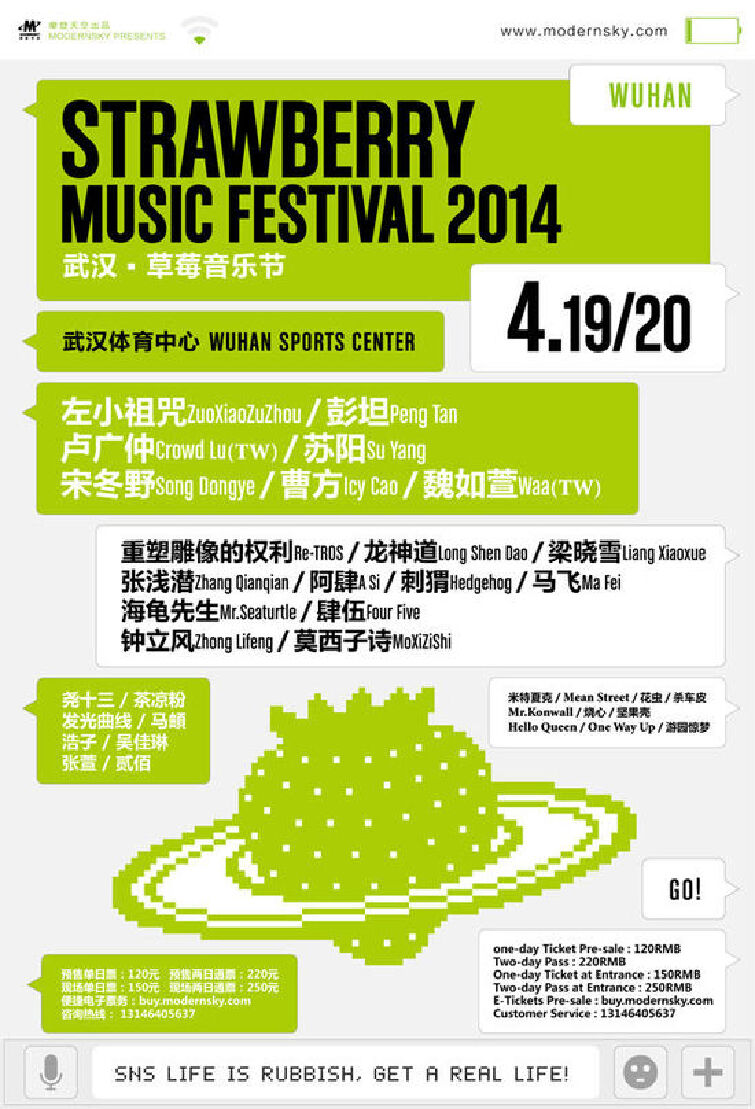 除舞台增加到三个之外,草莓音乐节特有的草莓生活馆、搭讪广场等内容依然将在本届武汉草莓大放异彩,带给观众最草莓的现场体验。本届草莓音乐节主题:“SNS life is rubbish, get a real life!”走出数字生活,鼓励真实接触,草莓生活馆、搭讪广场,将给观众提供最真实的接触体验。更有乐堡啤酒倾情参与,作为2014年与草莓全年合作的第一站,将给观众带来极具欧洲音乐节特色的元素与快乐。