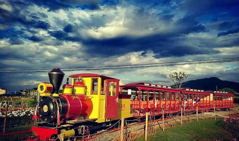 景区内火车文化浓郁,售票大厅、茶餐厅、超市、洗手间等基础设施均由火车厢改1建而成。景区更在爱心湖、富士山、湖心亭等景区大景集合区块铺设了全长约 公里的小火车轨道,搭配特色观光火车,满足了游客乘着火车开进花海的浪漫情怀.