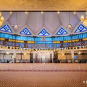 再进去就是宽阔、高大的祈祷大厅,可以同时容纳约8000人在此祈祷。大厅的屋顶是由49个大小不等的圆拱组成的,圆拱直径有45米,呈18条放射星芒。在祈祷大厅的旁边就是大尖塔,塔尖的形状像火箭,高73米,有电梯和楼梯通到上端,但是否开放,是否可以上去参观则需要当场询问工作人员。