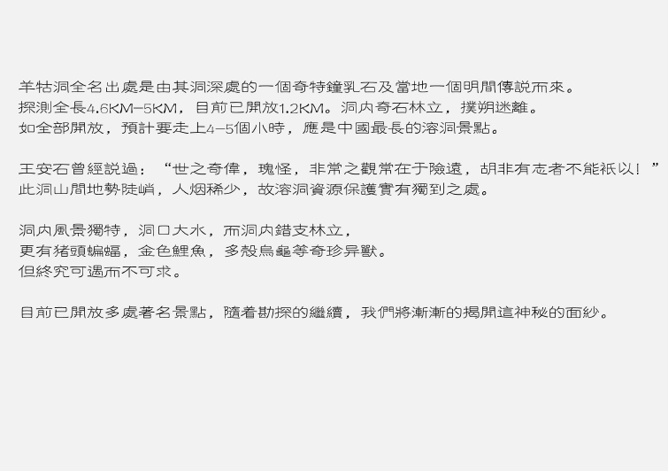 地图从卧龙谷上行二百多米,再左拐上山不远,便到羊牯洞。洞广约10平方米,人须弓身而进,内高数米,有泉穿岩而滴。传说西晋大臣羊牯,随晋武帝南下谋划灭吴,曾驻军于此,遍施抚慰。民间还有洞中借碗的传说。