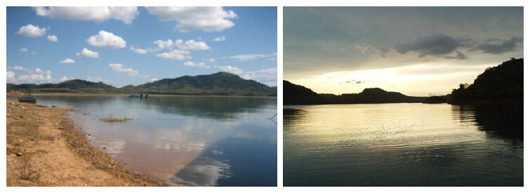 松涛天湖水域辽阔,酷似大海,白帆点点,渔歌满江,景色多变。平日里烟波浩渺,波光粼粼,激怒时,巨浪翻涌,飞溅岸礁。夕照下,松涛坝区霞光灿烂,掩映着殷红的水面,水天一色,衬托着起伏的山峦和婆娑的椰林,山青水秀,壮美绚丽,如诗如画。