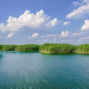 每到春夏时节,湖水清澈见底,品类各异的小鱼悠游往来,各种各样的鸟儿盘旋在烟波浩渺的湖面上,在芦苇荡内忽隐忽现,让人遐思不已。湖内有一座水库和一个渔场,设置游船供游客饱览湖光山色,并可在船上品尝鲜鱼。