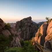 按逆时针行走的话,在巨峰环线中的一处景点便是灵旗峰,这里南面大海,蓝天白云,可以感受到海上名山。接着便是一线天,在一线天两壁间上方有一硕大的圆形巨石被夹在缝中。过了一线天便能看到——崂山的高峰。它就像一把利剑直刺青天,可沿着由人工开凿的石阶登上瞭望台。从峰顶举目远眺,海光山色,尽收眼底。下了瞭望台向前便会来的牡丹坡,每年四五月份的时候,漫山的杜鹃红花绽放,娇艳似火。然后便是丹炉峰,这是仅次于的大高峰,这里峰顶较平坦,可容数百人,是观日佳处。山峰顶部北侧一组裸岩似“丹炉袅袅”,在山峰上的还有“姊妹石”、“危岩悬殊”等象形山石。