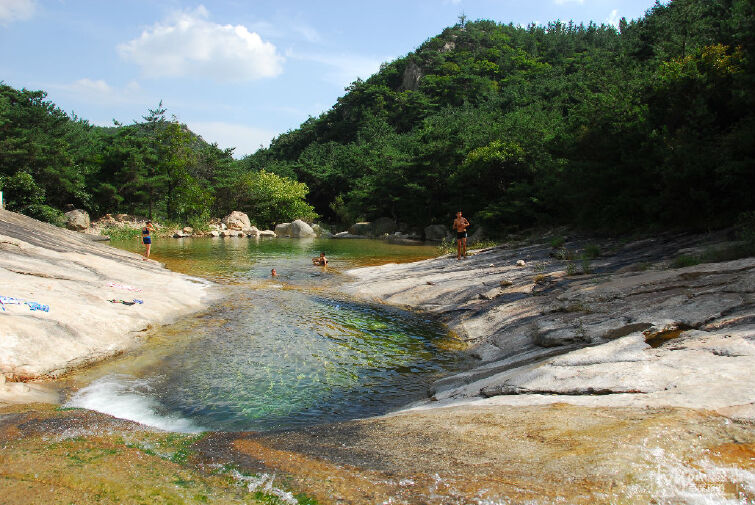 沿龙王庙南上约千米,有高约百米悬崖石壁,居中梯列9个大小不等的天然石池,大者直径6米,深3米,尾摆东北,腰部几曲向南,呈巨龙上山之势。天生地就,奇险妙绝。传说古时候东海有九条神龙,因触犯了天条,被玉帝镇居于此,巨龙挣脱羁绊,返回大海,而此山便留下了这坎坎九池,故名九龙池。池水源于山涧泉水,甘甜清洌,清澈见底,终年长流不息,春时细流涓涓,回清倒影;夏时飞瀑奔溅,风激悬流,活象一条七彩巨龙,飞流直下三千尺,宛如撒珠喷雪,壮观无比;秋天碧波荡漾,鳞光闪闪;冬时冰笋倒挂,含珠吐玉。瀑布之长、之大在山东省罕见。在这里,可看到龙王庙、龙潭、龙王阁、古木瓜、仙翁石等。