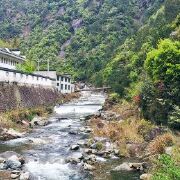 过了入口途中会先经过逍遥河水电站,一路沿着石阶向上攀爬,沿途的左手边是陡峭的石壁,春天会有流水从石壁中渗出,右手边则是悬崖,对面的山峰造型奇特,不妨留意一下,像人脸。爬过长长石阶小道,便来到了关门。关门是由4根岩石构成,门楣上刻有几个大字。在关口东侧有一个依山修建的拱形石亭,过往行人可在此避雨休息。