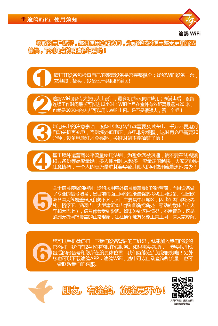 途鸽“wifi伴侣”可以在您海外旅行期间,提供移动数据、语音和当地旅行的资讯服务。24小时随时随地的全程中文服务,全球各国旅游资讯一网打尽,可以尽情满足您“吃、住、行、娱、购、游”等多种需求,另外使用这些服务,旅行者也无需再承担高昂的漫游费用,也无需为语言和文化障碍无法及时获得当地的通信服务而苦恼。
