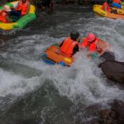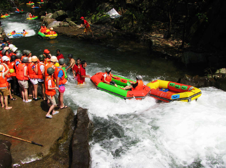 上游勇士漂全程2.5公里,需时约40分钟。这段河道落差大,水流急,弯道多。有人戏称,40分钟的漂流有大大小小40个高潮。勇士漂河段的原始石头较多,约有10几个险弯,而且水流量比之逍遥漂增加5倍以上,最大落差有2.5米,河道最宽3米。高滩大跌,石岩无数,刺激、惊险。美食信息2.5米,河道最宽3米。高滩大跌,石岩无数,刺激、惊险。