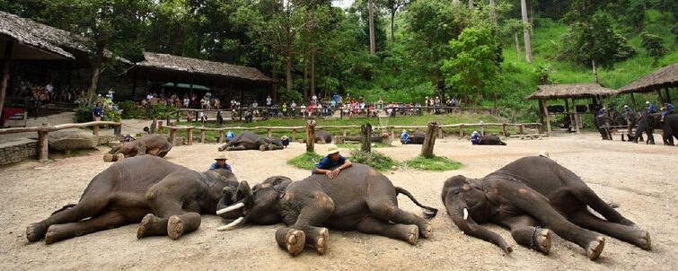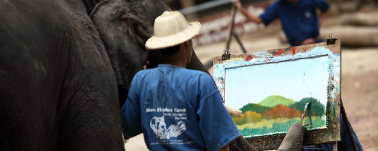 美沙大象营中的大象个个身怀绝技,它们很小就开始在这里接受各种技能的训练。它们会搬运东西、画出迷人的山水画、踢足球、投篮、戴帽摘帽、会翘起鼻子让您喂它吃香蕉。它们高兴的时候喜欢甩鼻子,那么长那么重的鼻子能飞速的摇起来转圈,甚至它们还会向您要小费。可爱,呆萌而又聪明的样子往往让游客非常喜爱。