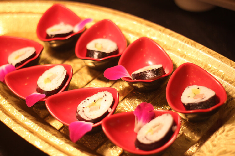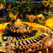 寿司旗舰拼盘、鲜虾唂嗲、玫瑰牛展、鹅肝酱拌、意式腌制西红柿、黑橄榄