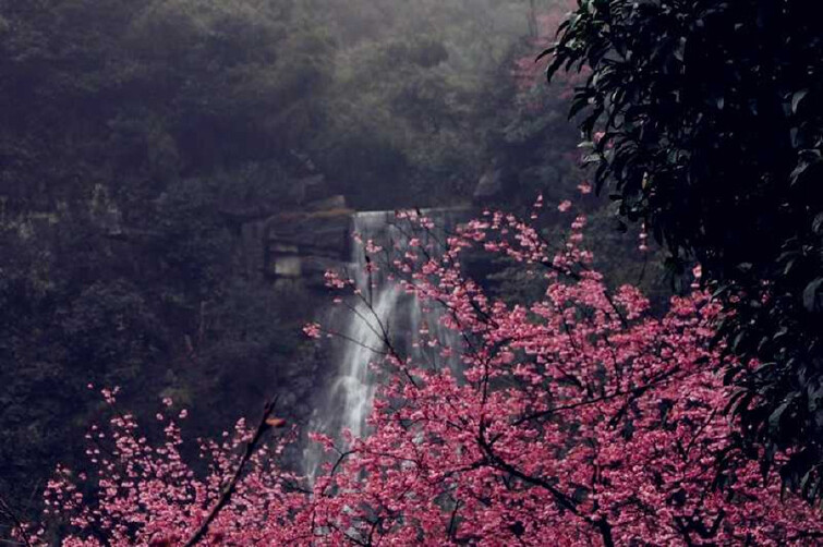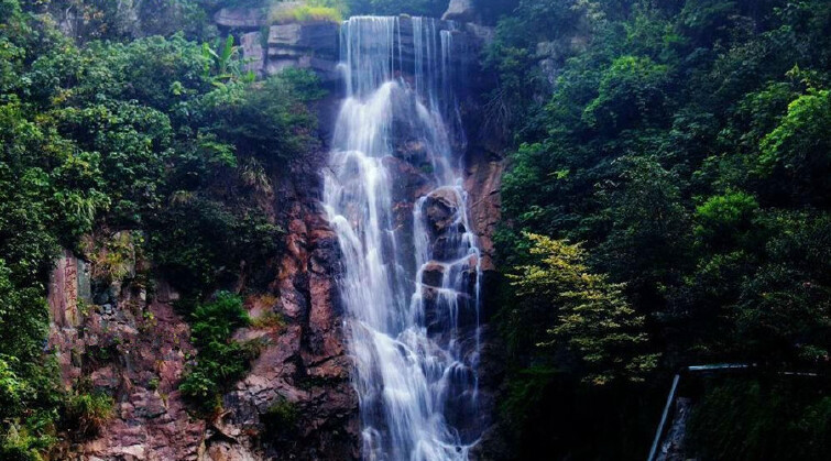 树林之间,郴州八景之一的王仙岭瀑布自40多米高的断崖直泻而下,色皎如练,声鸣似雷,气势磅礴。