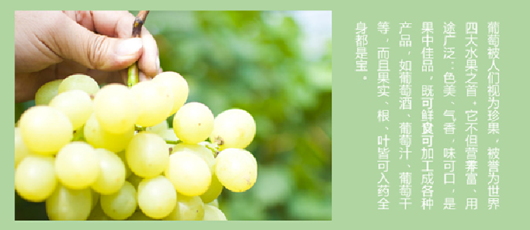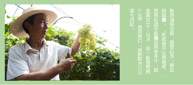 色泽清绿淡黄,晶莹似玉。果皮细腻脆嫩, “吃葡萄不吐葡萄皮”,质感似提子般脆硬且肉厚多汁,甜度高达18—20%,是一般葡萄的2-3倍,香甜爽口。