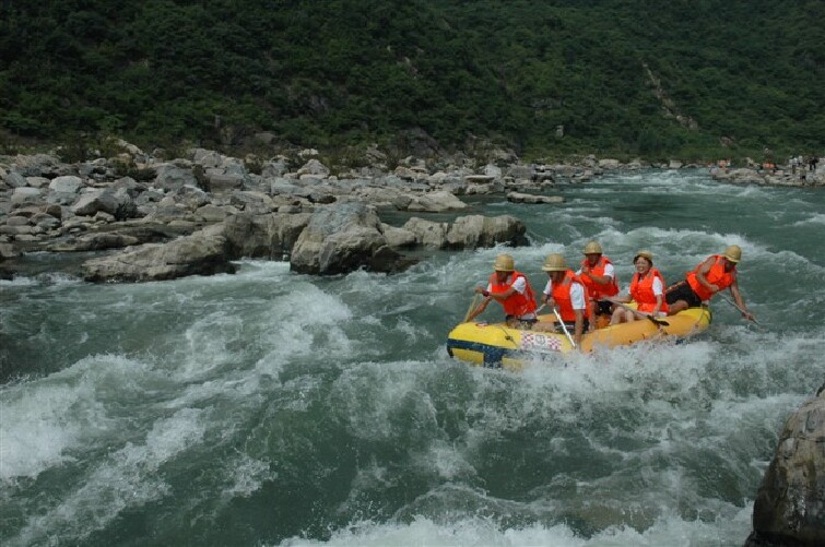 鹳河漂流位于老鹳河中段是丹江的源头,也是南水北调中线工程上游重要水源涵养区。主干流长 254 千米,流域面积 4219 平方公里,落差1340 米 ,漂流段落差 480 多米,是中原地带开发最早、距离最长、最刺激、规模最大的漂流项目,被人们称为“中原第一漂”;2007年被省工商管理局评为“河南省著名商标”。漂流全 程38公里,水上漂流12公里,河水平均流量20m3/s。因受到热带季风区大陆气候影响,降水多集中在5——10月份。河道时宽时窄,最宽处达30m,最窄处仅有5m,既有急流险滩,又有平湖深潭,是漂流的理想河段。
