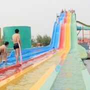 彩虹竞技滑梯:全中原规模最大的彩虹竞技滑梯,长85米,高12米。4条色彩斑斓的滑梯,在阳光下流光溢彩,绚烂夺目。想象下置身于清澈的水流中从12米高处飞流直下的感觉,恍惚间似乎真有一种从雨后彩虹中飞出来的错觉。