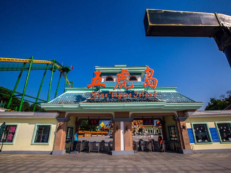 五虎岛游乐园由吉林松花湖风景名胜区管理有限公司开发建设,自2012年8月开始建设至今,更新改造原有破旧设施,改造恢复部分2010年水毁设施,共安装建设悬挂式过山车等大型游乐设施7个,中小型游乐设施10处,包括餐饮、游乐世界、休闲长廊及珍稀名贵动植物观赏等。