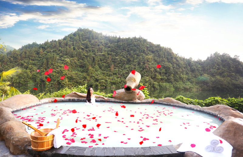温泉之水取婺江江脉深处、无色无味、水质清澈透明、富含多种对人体有益的矿物质和微量元素。具有美容养颜、镇静催眠、放松精神、消炎止痛、减肥等功效、对心血管系统、关节炎及神经、皮肤、消化等系统的疾病都有明显疗效、这里花香四溢、古朴典雅、是华东地区少有的旅游胜、避暑、疗养、度假、休闲胜地。