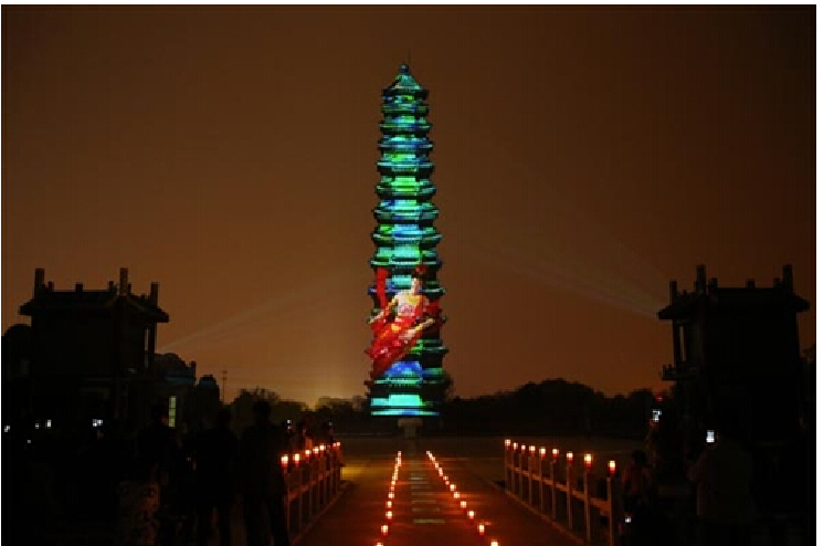 铁塔光影秀运用4D成像、全息技术、建筑投影、水幕电影、激光造型等手段,通过香雾等机械手段,以空灵圣洁的主题音乐为背景,使观众的嗅觉,在一瓣心香的作用下,感悟佛法,品位甘苦。为观众呈现美轮美奂、超级震撼的视觉效果。