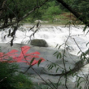 悬泉山下淘金河,天设地造了一处瀑布潭群,形成了五公里长的天然石峡,罗列着十余个大小不一,形态各异的瀑布渊潭。有的喷珠吐玉,有的飞沫扬雪,有的琼花飞溅,有的声 若雷鸣,真乃三步一潭,五步一瀑,瀑连潭、潭连瀑、潭中有潭、瀑下有瀑,尤其是雨潭、风潭和龙潭,风格更是别具一致;再观两侧是峡谷如切,灌木成林,松柏 叠翠,郁郁葱葱。