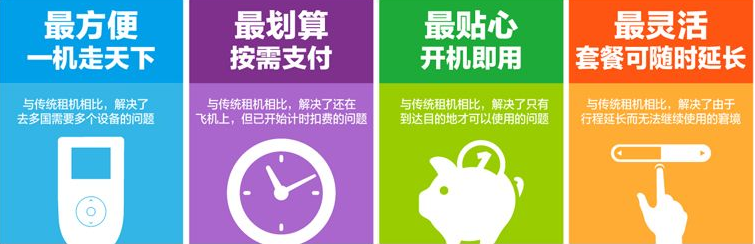 客户抵达旅行目的地,下飞机后开机确认使用漫游宝的全球漫游服务时,才开始计费,24小时不限量使用。这不仅节省了在长途飞行中支付的租机费用,而且也改变了在一次旅行中为多台机器同时支付租金,而实际上每到一地只能使用一台机器的传统租机收费的不合理之处。
