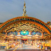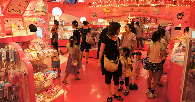 主题乐园也有广泛的礼品店以三丽鸥的卡通人物为卖点,夏天的夜里还能观看到烟花。