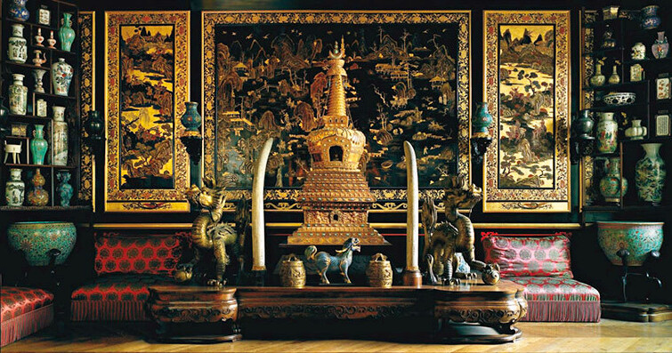 ·其中中国馆由拿破仑三世时的欧也妮皇后(Eugénie)主持建造,馆内陈列着中国明清时期的古画、金玉首饰、牙雕、玉雕、景泰蓝佛塔等上千件艺术珍品,这些藏品大多来自圆明园,为法军统帅蒙托邦献给拿破仑三世帝后的战利品。