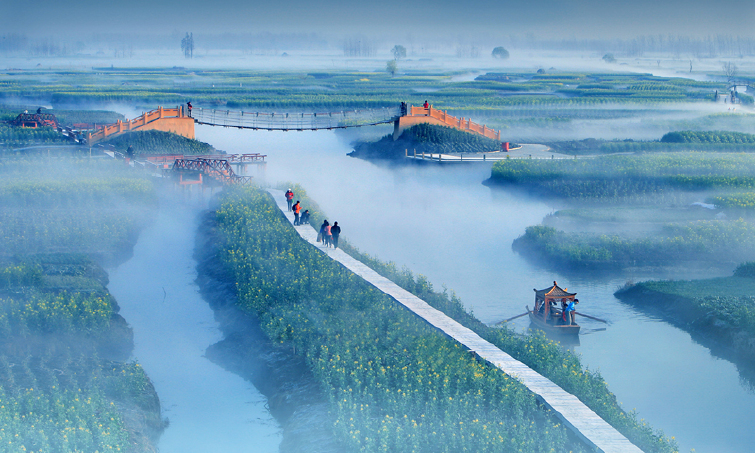 春去秋来,在这千垛田间,见万寿菊花,黄叶纷飞,妍丽雍容,在重阳雨后,闻菊酒,品肥蟹,看万花黄透,真可谓美不胜收。 每逢季节变幻,千垛的独特自然环境与温差,共同形成了如梦似幻的平流雾奇观,百里垛田间,云雾缭绕,花朵氤氲,水雾幽郁,使人神荡魂销、分不清现实与梦境。