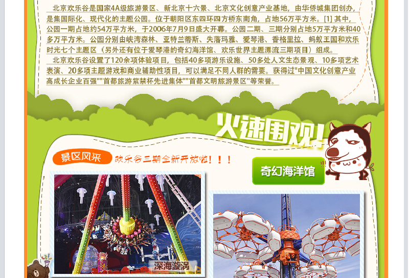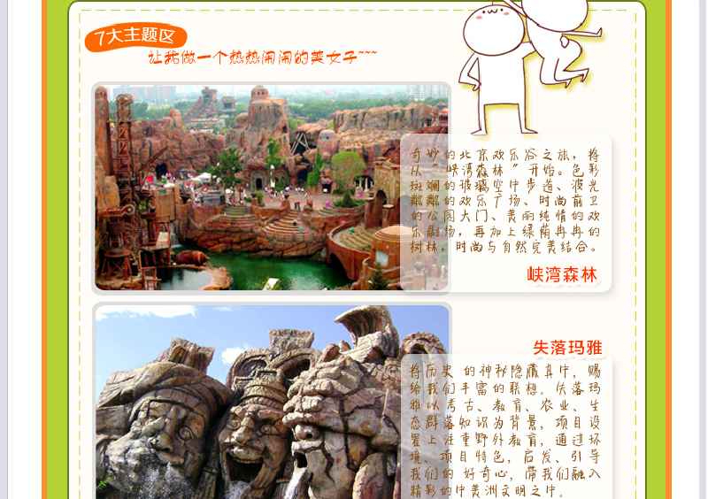 地图北京欢乐谷是华侨城集团以 20 年的专业积累,北京欢乐谷用四年时间倾心打造的主题生态乐园,北京欢乐谷是北京文化产业的区域龙头,北京欢乐谷是中国现代旅游的经典之作。 北京欢乐谷以时尚、动感、欢乐、梦幻的人文魅力,北京欢乐谷成为北京体验旅游的重要标志!北京欢乐谷是所有人的欢乐谷。北京欢乐谷是家庭旅游的首选之地,北京欢乐谷是学生名副其实的开心课堂,北京欢乐谷是青年人娱乐的开心地,北京欢乐谷是企业文化活动的绝好场所。