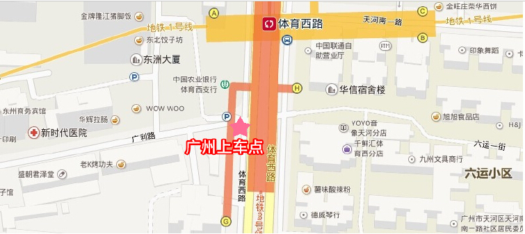 广州上车点:地铁天河体育西站(地铁A出口右行50米,或地铁G出口转左20米,农行银行旁广利路口)