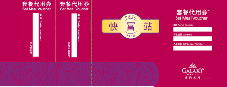 【费用说明】:澳门银河快富站美食餐劵(电子票) 一张,网站价格已包含服务费!