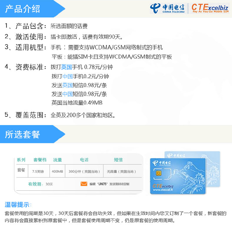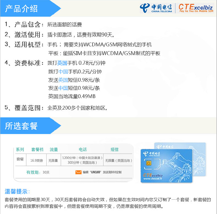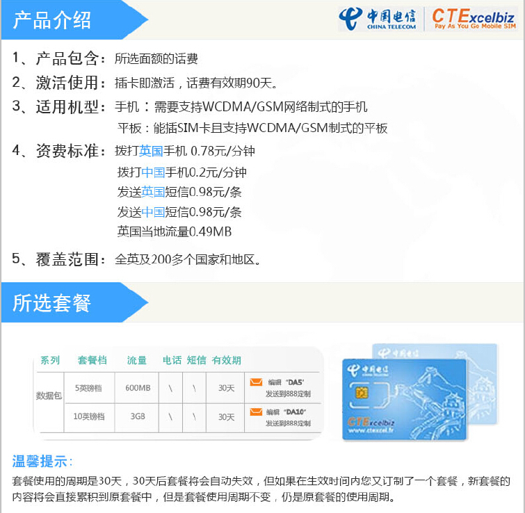 中国电信CTExcelbiz“英国”手机SIM卡说明