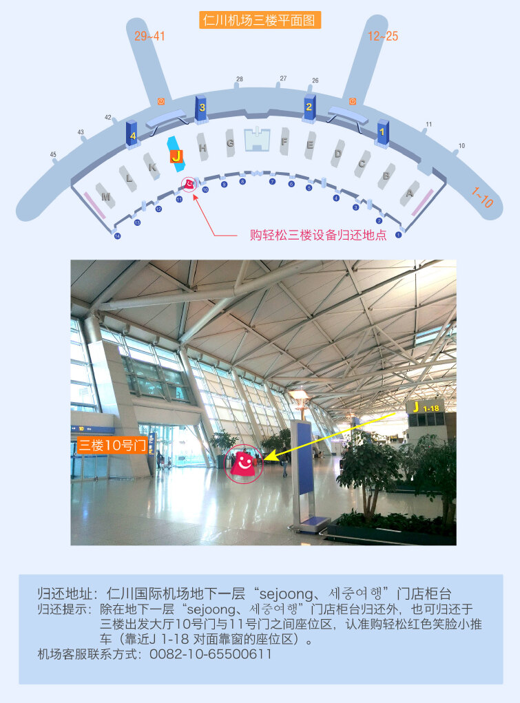 归还提示:除在地下一层“sejoong、세중여행”门店柜台归还外,也可归还于三楼出发大厅,抵达三楼后找10号门,在10号门与11号门之间,找购轻松小推车。