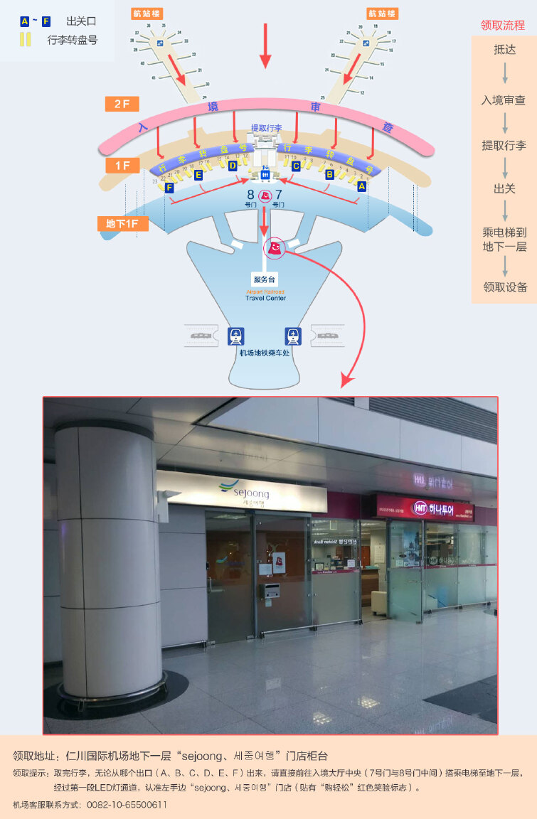 领取提示:取完行李,无论从哪个出口(A、B、C、D、E、F)出来,直接走到入境大厅中央(7号门与8号门中间)利用电梯到地下一层,穿过第一段LED灯通道,认准左手边“sejoong、세중여행”门店(贴有“购轻松”红色笑脸标志)。