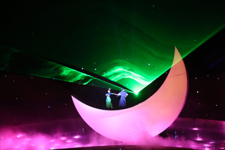 《敦煌盛典》以一段传奇的爱情故事为主线,通过借助鸣沙山•月牙泉的大漠黄沙及敦煌山庄辉煌汉唐建筑群等实景。再造包裹式洞窟、月牙泉等舞美场景。独创360度旋转可前后移动观众席,全新运用墙体秀、裸眼3D、全息影像等现代舞美