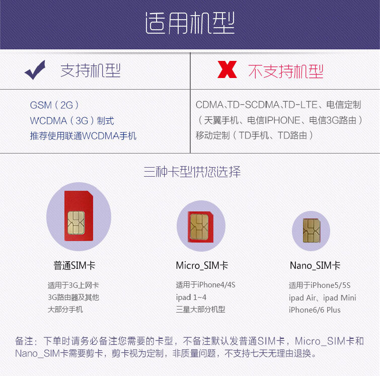3.本卡最新版为三卡合一卡型,大卡套小卡,无需特别注明您的手机卡大小。
