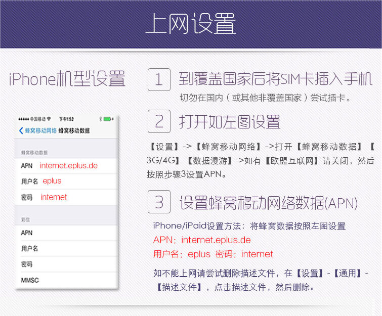 (1)iPhone设置:设置→蜂窝移动网络→启用3G、蜂窝移动数据、数据漫游→APN:internet.eplus.de,其它为空(若无法手动设置,请选择:设置→通用→还原→还原网络设置);