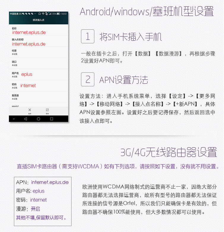 (2)Android设置:设置→无线和网络→移动网络→接入点名称→新建APN→APN:internet.eplus.de→保存并使用该APN