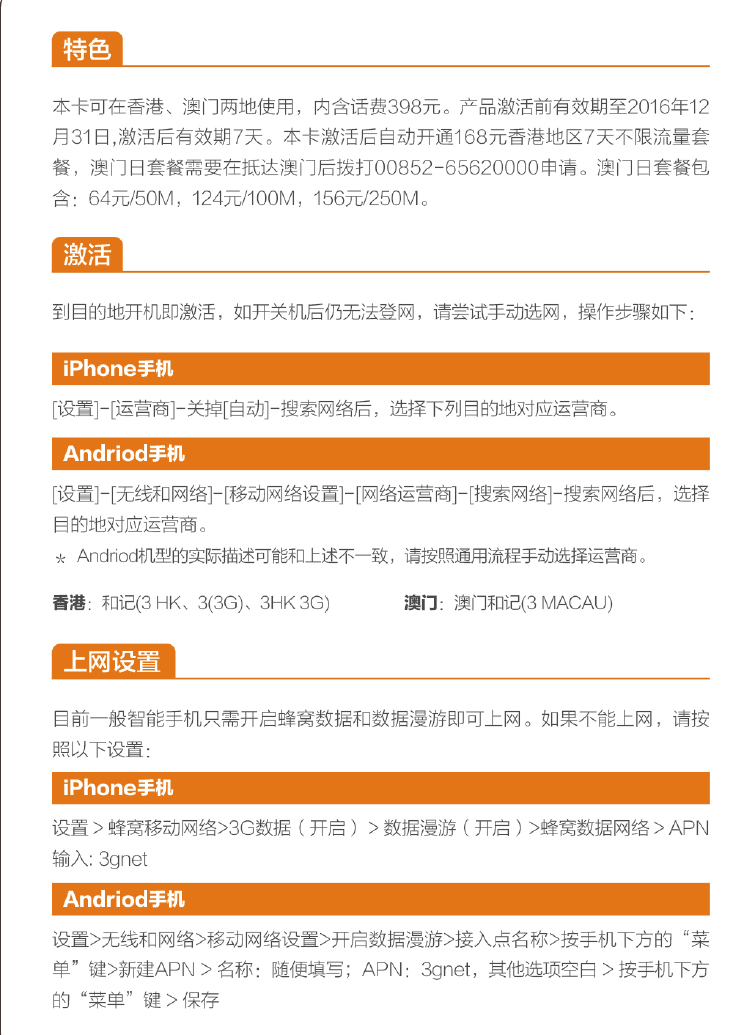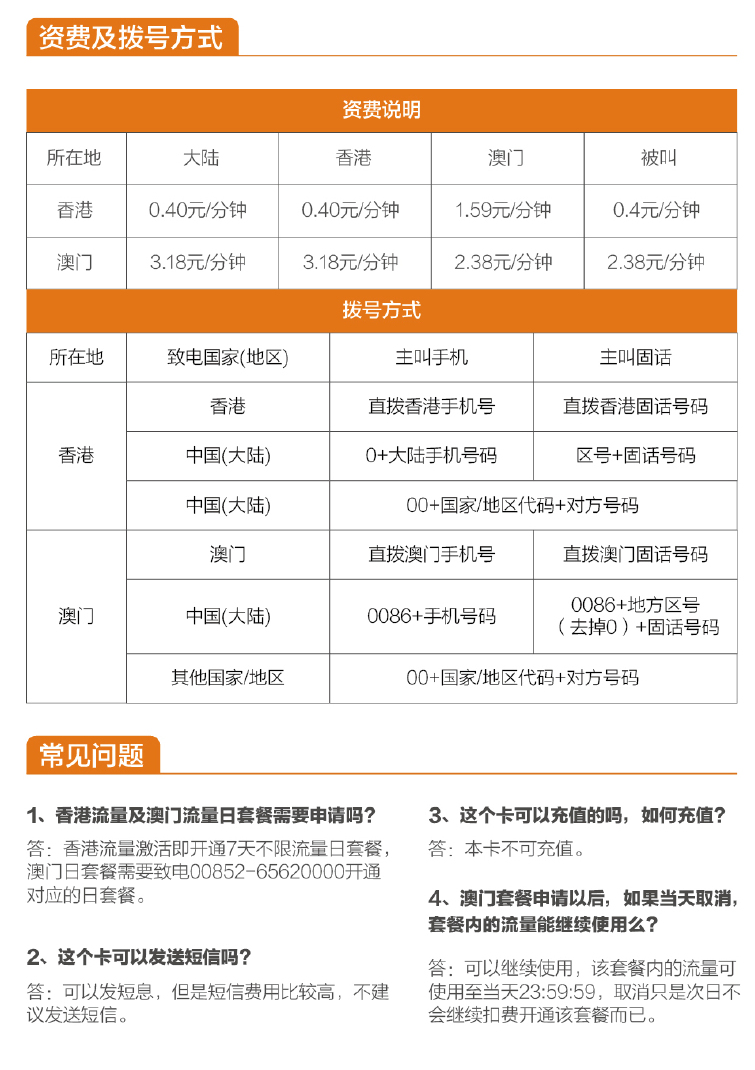 用户在香港、澳门插卡开机激活,即享受无限流量。用户可以用该卡在香港、澳门两地使用短信、语音、数据功能,激活后有效期7天。