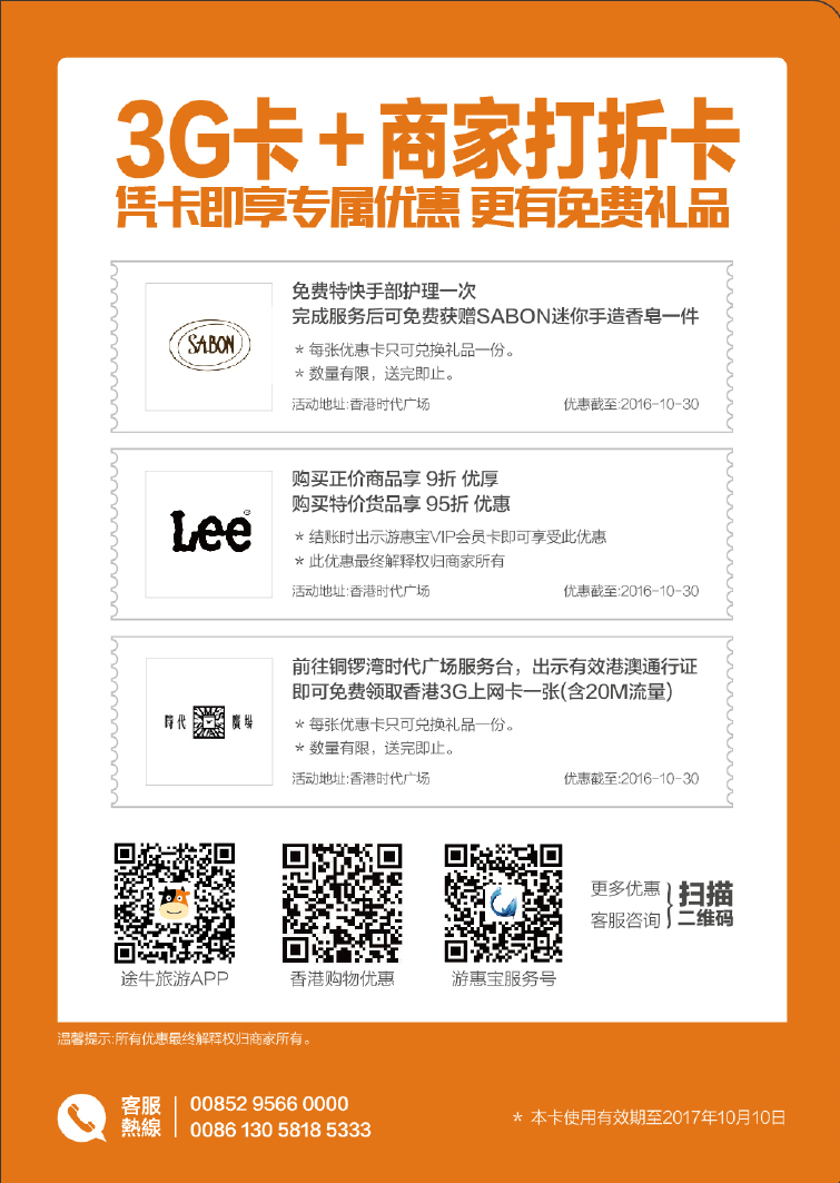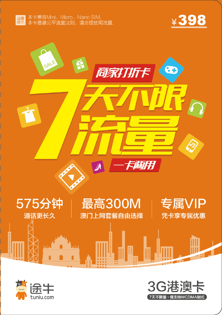 港澳398面值电话卡(仅限香港和澳门地区使用):