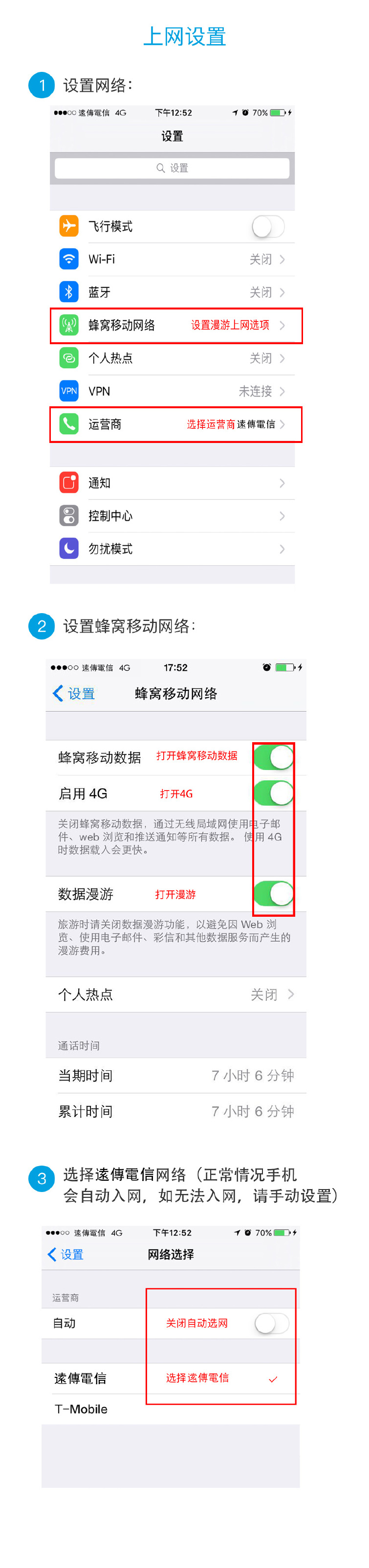 iOS系统:【设置】-【运营商】-关掉【自动】-搜索网络后,选择相应运营商,例:奥地利,选择“Orange”。