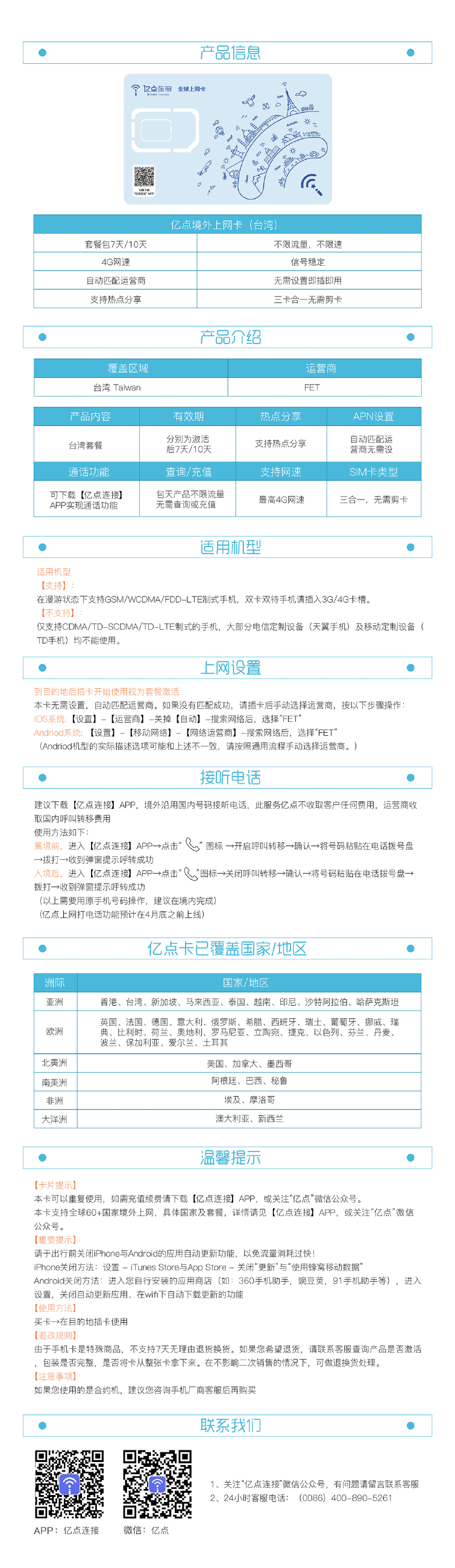 6) 亿点全球上网卡支持手机制式:WCDMA(3G)、GSM(2G),台湾及马来西亚部分地区支持FDD-LTE(4G)。