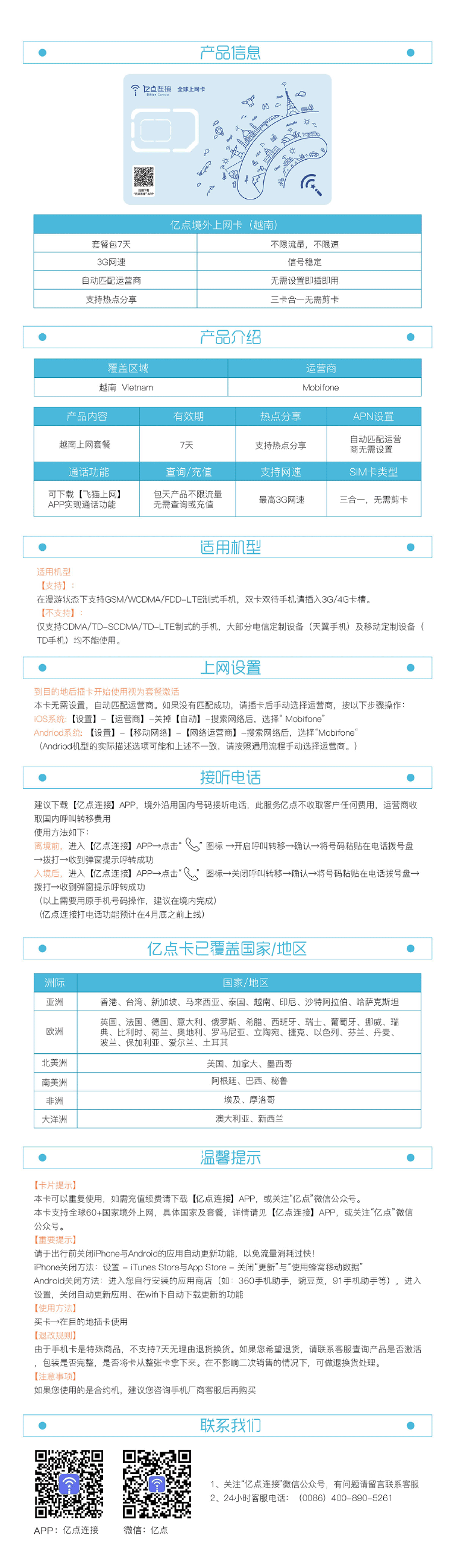 6) 亿点全球上网卡支持手机制式:WCDMA(3G)、GSM(2G),台湾及马来西亚部分地区支持FDD-LTE(4G)。