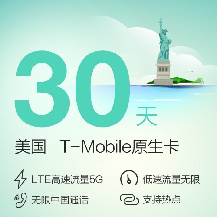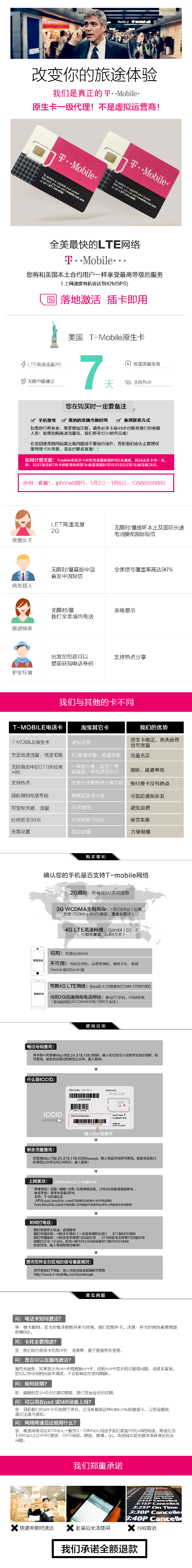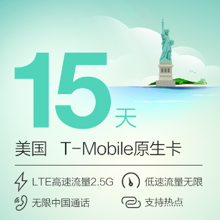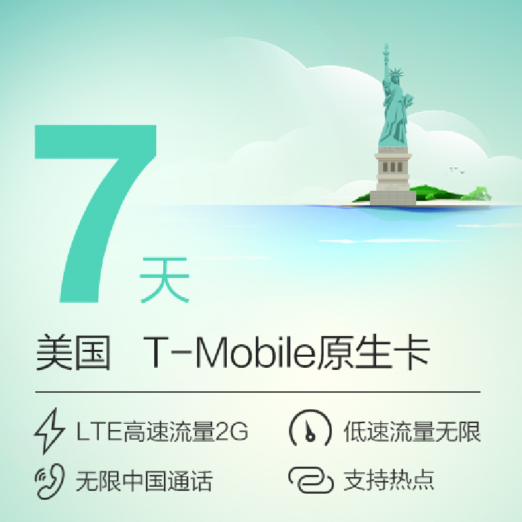 产品介绍: 足量高速流量(根据您选择的套餐时长,有所区别。如7日套餐2G高速流量。) 无限低速流量(高速用完自动降速) 无限时/量直拨中国,直发中国短信 无限时/量拨打全美境内电话,收发全美境内短信 无限时/量接听本土及国际长途电话,收发国际短信 支持热点分享 来电显示 它全美信号覆盖率高达96% 出发前您就可以提前获知电话号码!预订须知: 2G:所有GSM手机适用 3G WCDMA主用频段:1900Mhz(如果支持1700Mhz AWS频段,覆盖会更好) 4G LTE高速网络:Band4(B2,4,12都有覆盖,以B4为主) 可用:大部分iphone 不可用:电信合约机,运营商锁机,被盗手机,美国Verson版和Sprint版 其他手机 可用4G LTE网络:Band2,4,12或者WCDMA 1700/1900 可用2G低速网和电话短信:移动TD手机,GSM手机(移动定制机 WCDMA850和1900不支持)如何购买: 1. 手机型号 2. 落地的准确当地时间 3. 如果您行程有变,需要增加天数,请务必关卡前48小时联系我们的客服人员!如需加购高速流量包,我们将在12小时内完成! 如何计算天数:Tmobile系统开卡时间为美国西部时间0点激活,到24点关卡为一天。例:10.01激活的7天卡的使用时间即为: 美国西部时间10.01日0点到10.07日晚24点。上网设置:仅适用于更改过出厂上网设置的手机 苹果手机:设置-通用-还原-还原网络设置,打开4G及数据漫游即可。 安卓手机:需手动设置APN. 名称:T-MOBILE APN:epc.tmobile.com(只能用3G或者H+的手机适用) fast.t-mobile.com(不能使用LTE网络的手机使用此APN上网速度会非常慢哦) 如何拨打电话:拨打美国本土电话:直接拨号 拨打中国手机:+86手机号码(+ 长按零键即出现) 01186手机号码 拨打中国座机:+86区号去掉第1位0座机号 01186区号去掉第1位0座机号 如拨打010-12345,即为+8610123456或者01186123456. 收发短信,输入号码同拨打电话! 实用查询: 查电话号码:http://52.24.213.118:3000 查剩余流量:http://52.24.213.118:3000/usage 查信号覆盖: http://www.t-mobile.com/coverage