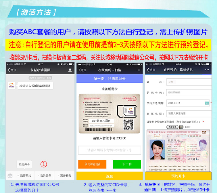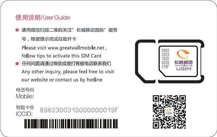 2、关注“长城移动国际”微信公众号:用微信扫描卡背面的二维码,即可关注。回复“9”即可联系在线客服。