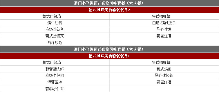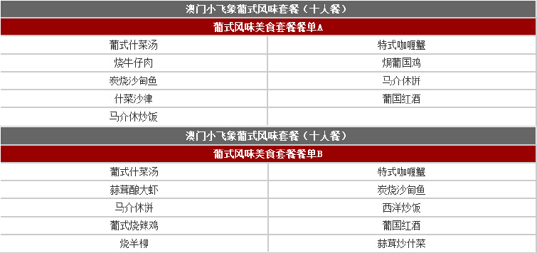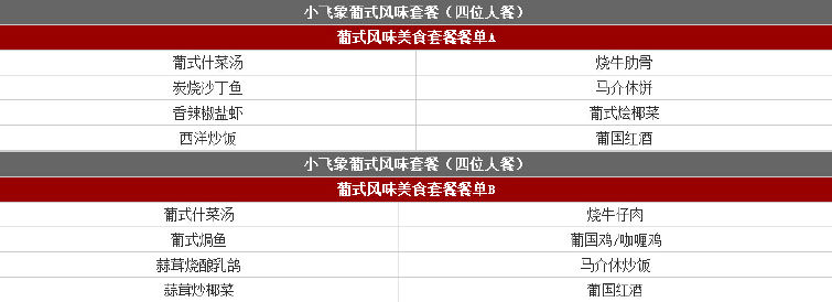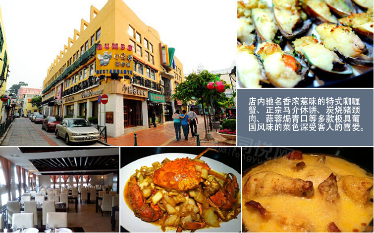 澳门小飞象葡国餐餐厅是以烹饪正宗葡国菜的风味餐厅之一。澳门的葡国餐比其他地区都更为便宜且正宗。在芸芸众多的葡国餐厅中, 位於氹仔地堡街的小飞象葡国餐厅除了继承正宗葡国餐的风味外,份量也是十足,可谓质量兼备。小飞象餐厅内设有350个座位,无论平日或是节假日,都有很多本地居民和游客慕名到小飞象葡国餐厅一尝地道的葡国餐,但由於餐厅并无在外地开设任何分店,想品尝原汁原味的葡国餐就一定要来澳门了。