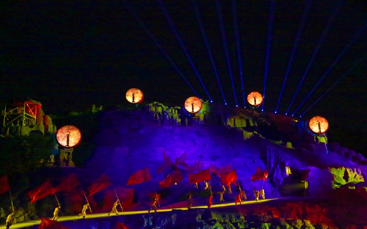 远处传来马蹄声由远及近,瞬间,在大山断壁下,一队骑士手持龙旗,穿越到观众眼前。几十米高的峭壁上,巨鼓悬挂,壮士们挥臂擂鼓,震耳欲聋,这时,观众会看到奇特的景象,挂在崖壁上的巨鼓向观众席飞来,同时山壁间的巨龙慢慢升起,5000吨大水从天而降,水面达百米之宽,胜似黄河壶口瀑布,气势磅礴,溅起的水雾扑向观众,引发一片尖叫,带来无限的震撼、刺激。