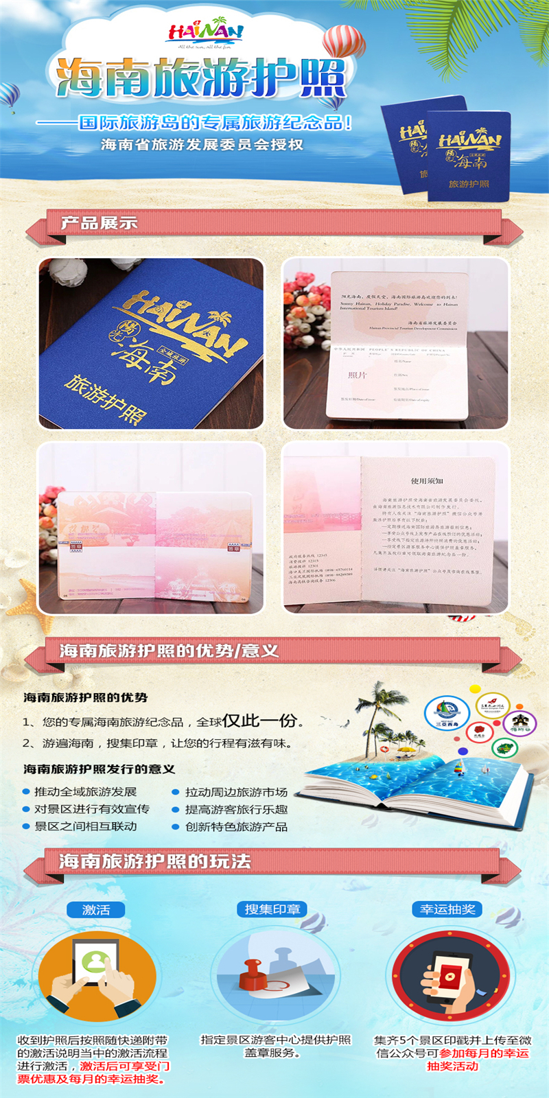 海南旅游护照是经海南省旅游发展委员会批准,面向广大旅游爱好者发行的一款集收藏性、趣味性、纪念性、互动性、商务性为一体的创新旅游产品。