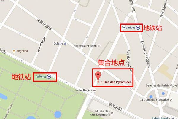 附近三个地铁站步行可至出发地点,Pyramides站(7号线、14号线),Palais Royal Musee du Louvre站(1号线、7号线)或Tuileries站(1号线)