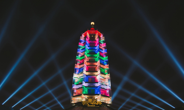 每天晚上演出开始之时,当《报恩盛典》插曲《心经》的宏大音乐骤然响起,塔身周围的幻光瞬时间照亮了南京中华门外的夜空,使得千年的圣塔与佛光再现。