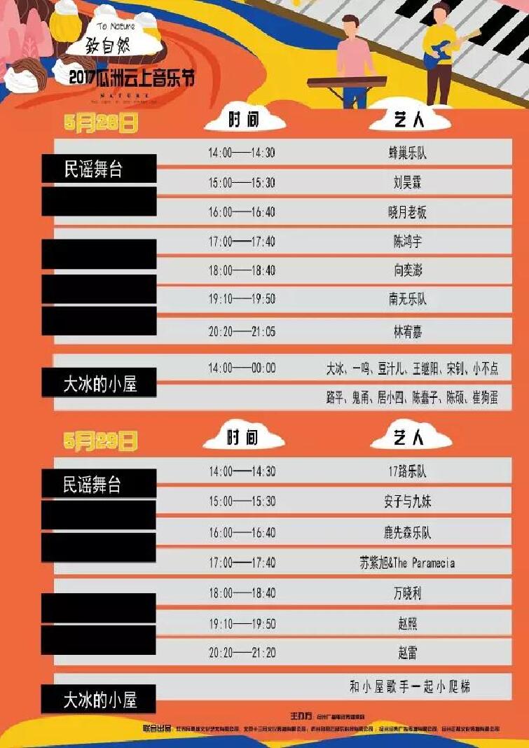 十三月文化用6年的时间创造出了民谣在路上这个巡演品牌,不断发掘有潜力的音乐新人。今年既有老一辈民谣歌手万晓利,独特幽默的南无乐队,还有近期巡演票房火爆的师徒赵照和赵雷难能可贵同场亮相。此外,十三月文化旗下号称民谣届段子手的晓月老板将带来音乐节首秀。当下最火新生代乐队鹿先森、民谣“爆款”陈鸿宇等一众民谣歌手,将全部出现在音乐节上一起嗨。
