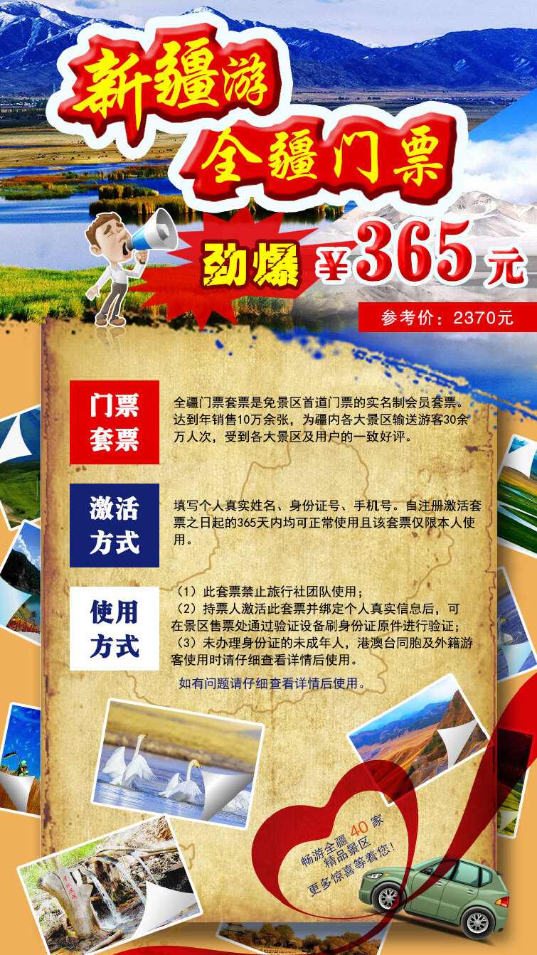 地图全疆门票套票是发卡方与签约景区联合推出的免景区首道门票的实名制会员套票。 历经四年的充分准备,一年的实际运行,达到年销售10万余张,为疆内各大景区输送游客30余万人次,受到各大景区及用户的一致好评。